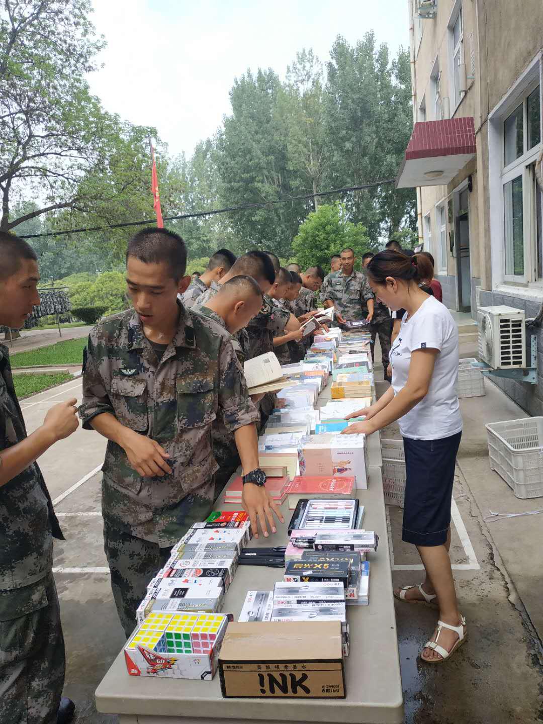 “八一”前夕,襄城縣店積極組織員工冒著高溫到駐軍部隊,開展主題流動售書活動,為戰(zhàn)士們送去豐富的精神食糧,受到熱烈歡迎。