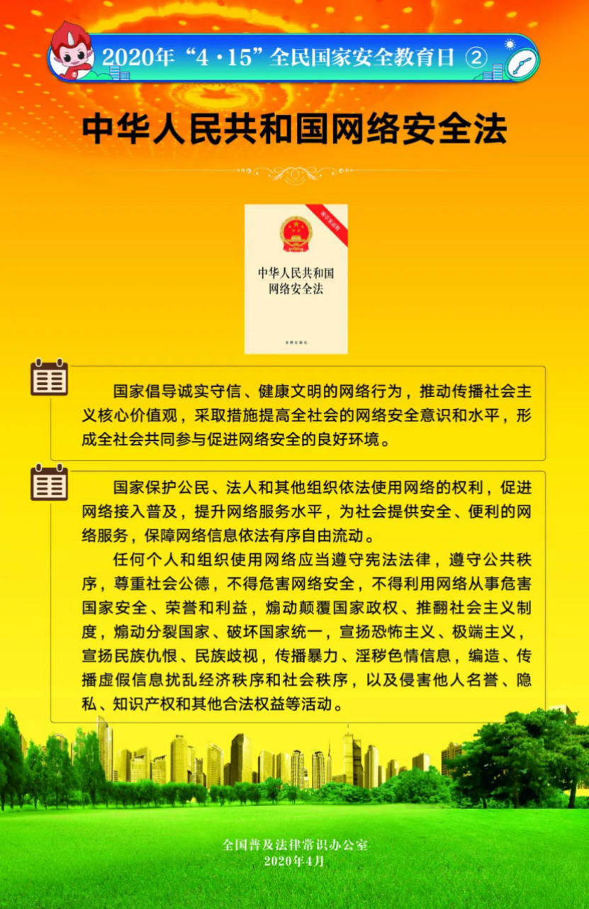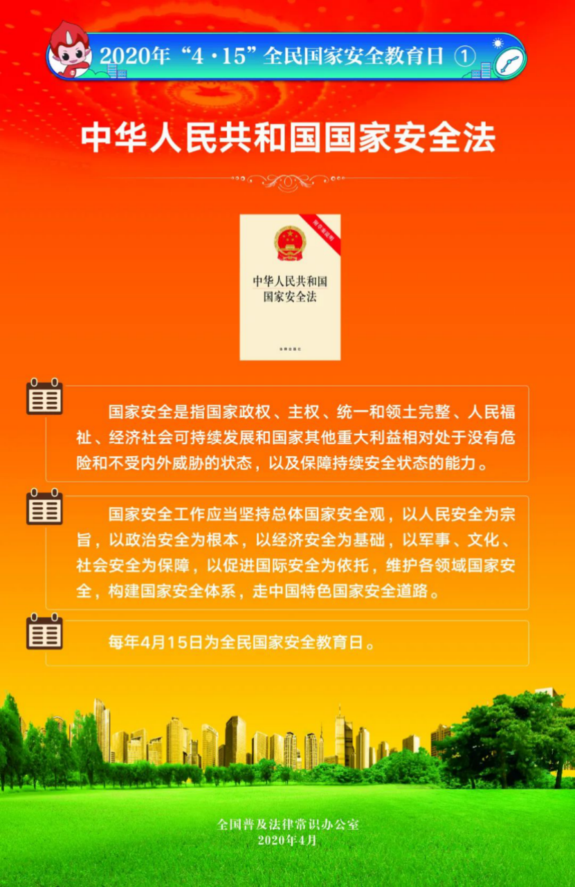 今年4月15日是第5個(gè)全民國(guó)家安全教育日。為提高全民國(guó)家安全法治意識(shí),全國(guó)普法辦組織編制了2020年全民國(guó)家安全教育日法治宣傳掛圖(一套6張),供各地各部門(mén)免費(fèi)下載使用。