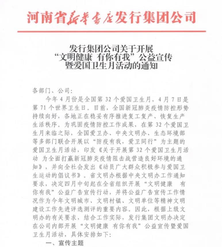 4月初,按照省文明辦“文明健康 有你有我”公益宣傳暨愛國衛(wèi)生月活動要求,發(fā)行集團積極組織開展宣傳活動,要求本部各部門努力踐行文明用餐、搞好環(huán)境衛(wèi)生,同時在書店各大賣場安排播放有關公益廣告,積極宣傳倡導使用公筷公勺、拒食野味等文明用餐習慣,為全面打贏新冠肺炎疫情阻擊戰(zhàn)營造良好環(huán)境。