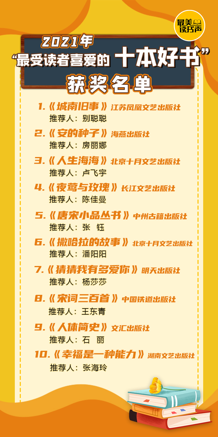 經(jīng)過激烈的角逐,由選手別聰聰推薦的《城南舊事》、選手房麗娜推薦的《安的種子》、選手盧飛宇推薦的《人生海!、選手陳佳曼推薦的《夜鶯與玫瑰》、選手張鈺推薦的《唐宋小品叢書》、選手潘陽陽推薦的《撒哈拉的故事》、選手楊莎莎推薦的《猜猜我有多愛你》、選手王東青推薦的《宋詞三百首》、選手石麗推薦的《人體簡史》、選手張海玲推薦的《幸福是一種能力》10本圖書榮獲“2021年度最受讀者喜愛的10本好書”。