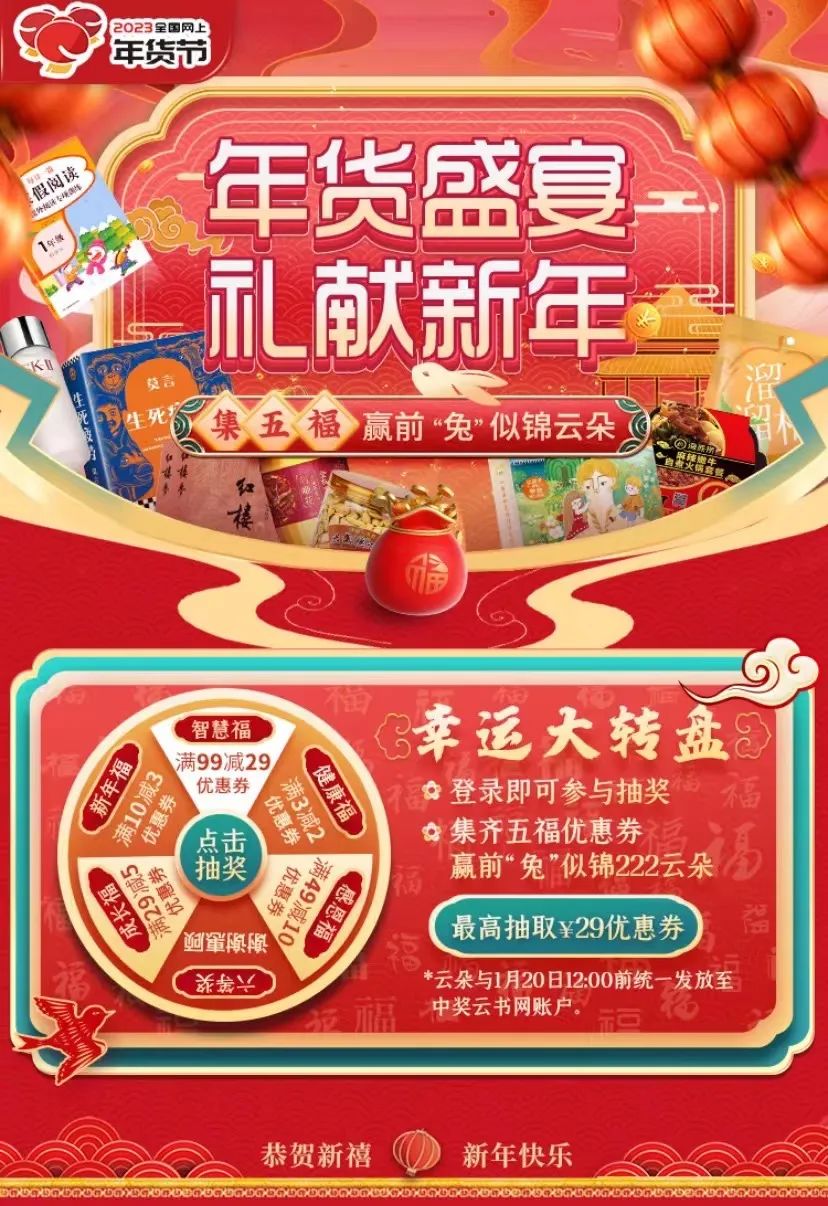 讀者還可參與云書網(wǎng)線上商城“集五福”得前“兔”似錦222云朵營銷活動;還有新年禮遇新人、紅包文創(chuàng)用品買1贈1等線上線下活動,更有超多圖書折扣,優(yōu)惠券等你拿。1月25日-1月27日,云書網(wǎng)將開展“新春讀好書,文化過大年”直播帶貨活動,關注“河南新華書店直播間”,每天精彩直播為你推薦正版福利好書,與主播互動可享更多優(yōu)惠哦。
