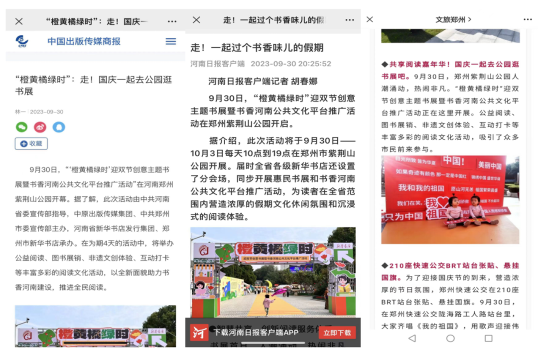 在剛剛結束的“雙節(jié)”8天小長假中,由省委宣傳部指導,中原出版?zhèn)髅郊瘓F主辦,河南省新華書店發(fā)行集團、全省各級新華書店聯(lián)動承辦的“橙黃橘綠時”迎雙節(jié)創(chuàng)意主題書展暨書香河南公共文化平臺推廣活動,在全省市、縣(區(qū))文化地標處圓滿舉辦。528場次的惠民書展、創(chuàng)意閱讀、潮流文旅、誦經(jīng)典、拆盲盒、手工制作等繽紛活動,深受人民群眾喜愛。