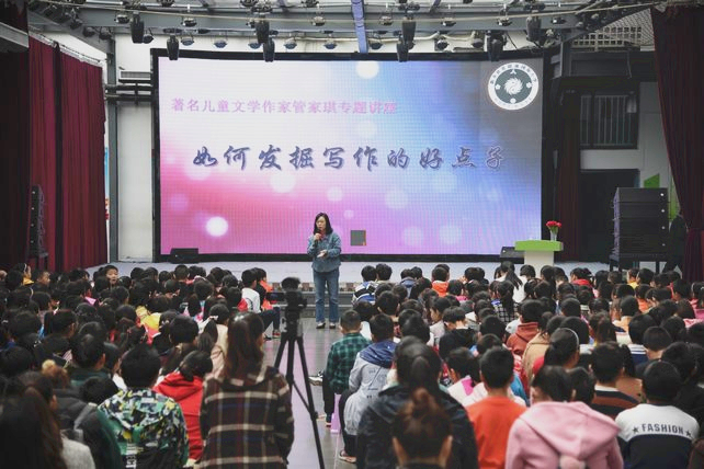 在“名家進(jìn)校園”活動(dòng)中,管家琪老師每到一所學(xué)校,都以自己如何與寫作結(jié)緣為引,談到自己獲得寫作題材的方法,鼓勵(lì)學(xué)生們?cè)谌粘V卸嘤涗洠龊霉P記,尋找發(fā)現(xiàn)的眼睛,結(jié)合寫作經(jīng)歷和生活小故事,以通俗易懂、風(fēng)趣幽默的語(yǔ)言和豐富的人生經(jīng)歷,和學(xué)生共同分享閱讀和寫作中的感悟,教學(xué)生發(fā)揮想象,感受寫作帶來(lái)的樂(lè)趣。精彩互動(dòng)環(huán)節(jié)中,管家琪老師以游戲的方式和孩子們玩起來(lái)寫作游戲。針對(duì)大家寫作方面的迷茫與困惑、管家琪老師與現(xiàn)場(chǎng)孩子們進(jìn)行真摯而親切的交流,解答孩子們的困惑。活動(dòng)現(xiàn)場(chǎng)氣氛活躍,活動(dòng)的最后管家琪老師還建議孩子們,在日常生活中,多閱讀名著以及積極向上的作品,它可以開闊視野,拓展思維,F(xiàn)場(chǎng)觀眾或積極提問(wèn)、踴躍發(fā)言,或認(rèn)真聆聽、認(rèn)真記錄,現(xiàn)場(chǎng)洋溢著開心閱讀氣氛。在每次講座結(jié)束后,管家琪老師還饒有興趣地為喜歡自己作品的小讀者簽名留念。