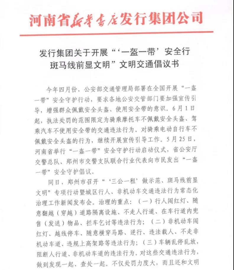 6月初,為響應公安部交管局、河南省和鄭州市交通部門關于“一盔一帶”安全守護倡議,發(fā)行集團發(fā)出了《關于開展“‘一盔一帶’安全行 斑馬線前顯文明”文明交通倡議書》,一如既往積極響應并支持配合上級部門的號召和工作要求,用實際行動,影響和帶動全社會廣大交通參與者不斷強化禮讓斑馬線、文明過馬路的意識。