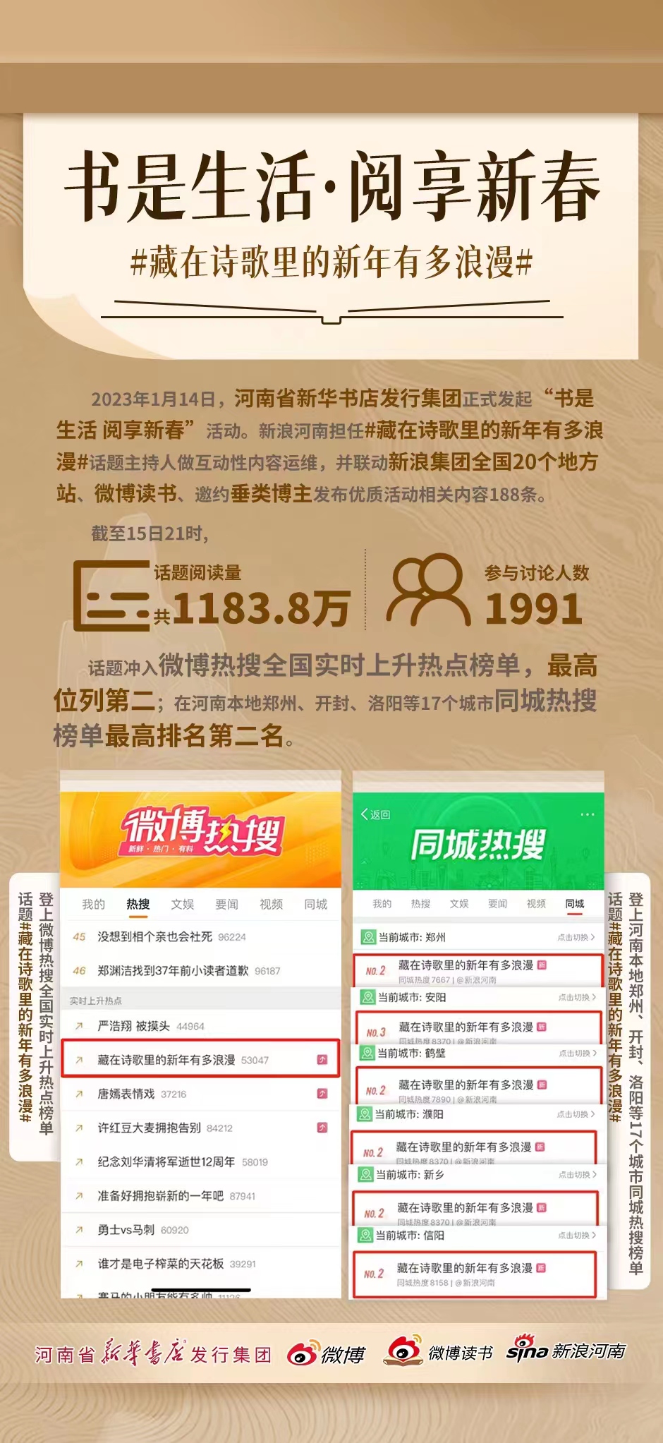 《百家講壇》主講教授王士祥、豫教音像社總編輯張瑞芳、朗誦名家肖灑等大咖做客尚書房海匯港店,把書香帶入年味兒,讓我們的節(jié)日更加有文化厚度,當天活動微博話題獲得全網(wǎng)970萬閱讀,精彩的活動內(nèi)容讓線上線下的廣大讀者紛紛點贊,躍居全國實時榜和同城熱搜榜第2位。至此,“詩詞里的年味兒”活動拉開了河南新華書店新春閱讀推廣序幕。