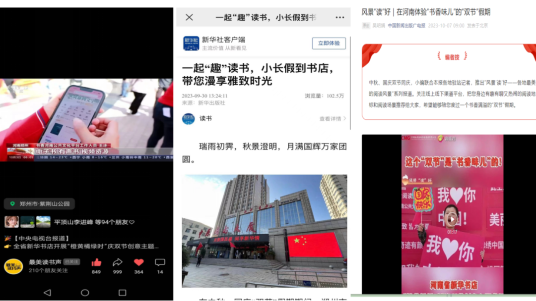 活動期間,各地新華書店協(xié)同發(fā)力,通過體驗式、沉浸式、互動式的文化表達形式,將線上線下充分融合,吸引眾多媒體爭相報道。9月30日,新華社客戶端以“一起‘趣’讀書,小長假到書店帶您漫享雅致時光”為題進行報道;10月2日,#國慶的河南是書香味兒的#等活動相關話題登上微博熱搜,閱讀量突破240萬次;10月3日,中央電視臺新聞頻道對整體活動進行重點報道。此外,學習強國、中國新聞出版廣電報、河南日報、河南電視臺、文旅中國、頂端新聞、今日頭條等權威媒體平臺共同聚焦報道,線上話題瀏覽量達到707.3萬次,全平臺總瀏覽量超2000萬次,有力實現(xiàn)了書香河南全民閱讀品牌的破圈傳播。