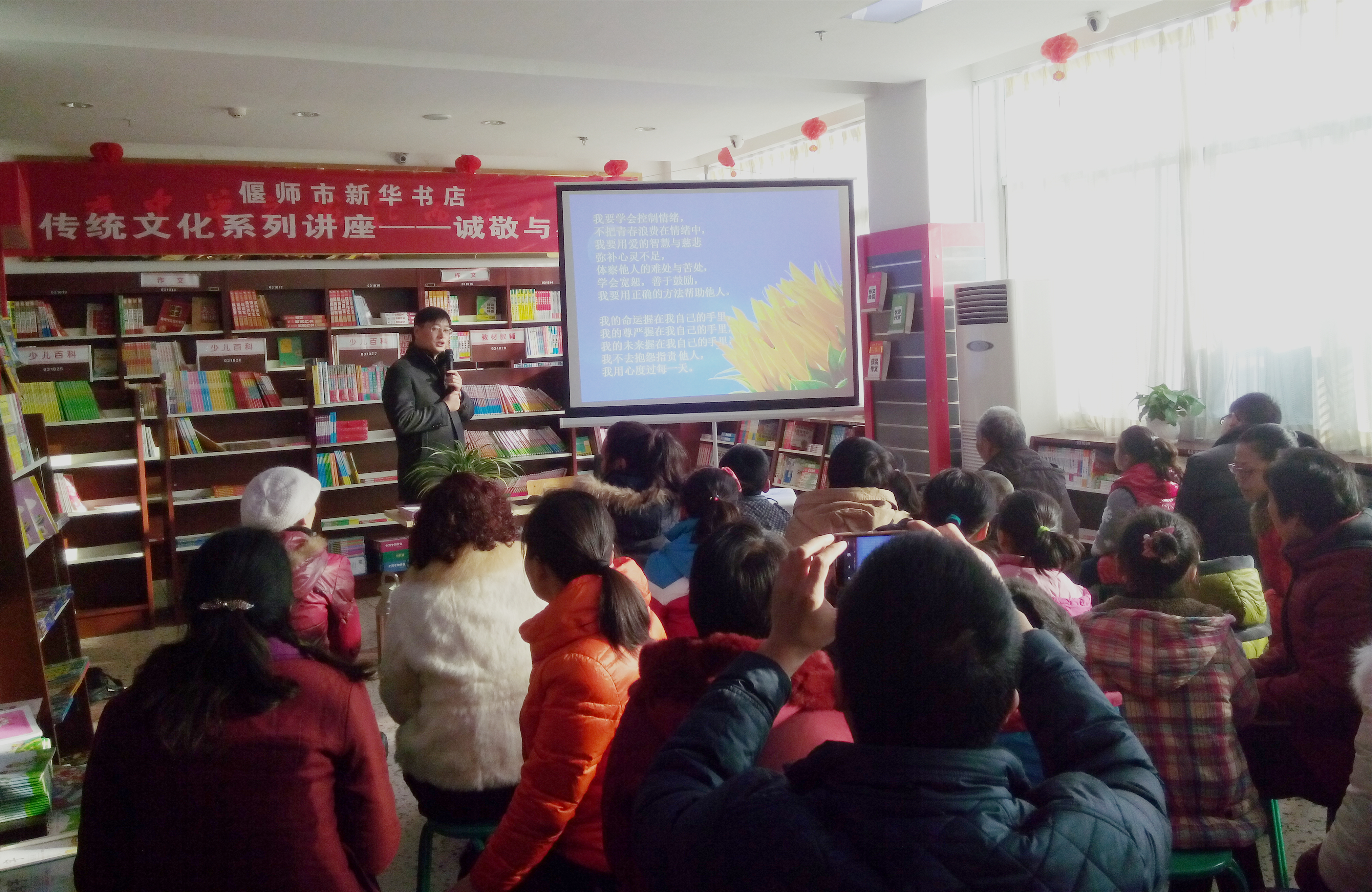 2月8日上午,偃師市店邀請知名教育專家肖俊峰老師到購書中心,為廣大學生和家長進行了一場精彩的傳統(tǒng)文化教育講座----誠敬與感恩。肖俊峰老師結合自己創(chuàng)辦睿源學校的親身經(jīng)歷,現(xiàn)身說法就如何感恩社會、如何孝敬父母等一系列問題與現(xiàn)場的家長和學生互動交流,現(xiàn)場不時爆發(fā)出陣陣掌聲。此次活動主題鮮明、內(nèi)容豐富、形式多樣,使在場的學生及其家長深受教育、獲益匪淺,紛紛表示望此類活動多多舉辦。