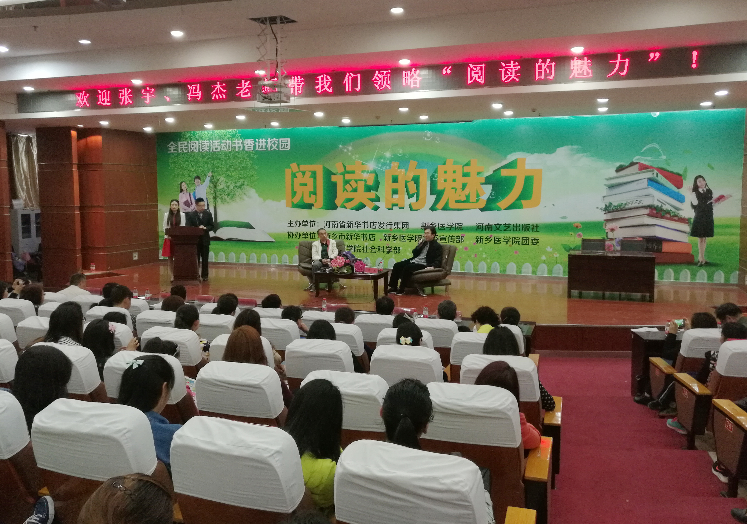 以世界讀書(shū)日為契機(jī),為將全面閱讀活動(dòng)引向深入,新鄉(xiāng)市店邀請(qǐng)河南省著名作家張宇、馮杰來(lái)到新鄉(xiāng)醫(yī)學(xué)院,與來(lái)自新鄉(xiāng)醫(yī)學(xué)院、新鄉(xiāng)市實(shí)驗(yàn)小學(xué)、紅旗區(qū)實(shí)驗(yàn)小學(xué)、河師大附中國(guó)際雙語(yǔ)小學(xué)和晨光讀書(shū)會(huì)的千余名師生、讀者暢聊“閱讀的魅力”。